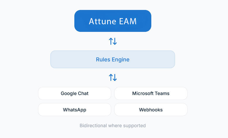 Push Attune alerts, approvals, and updates into Google Chat, Microsoft Teams, WhatsApp, or any webhook-enabled platform.