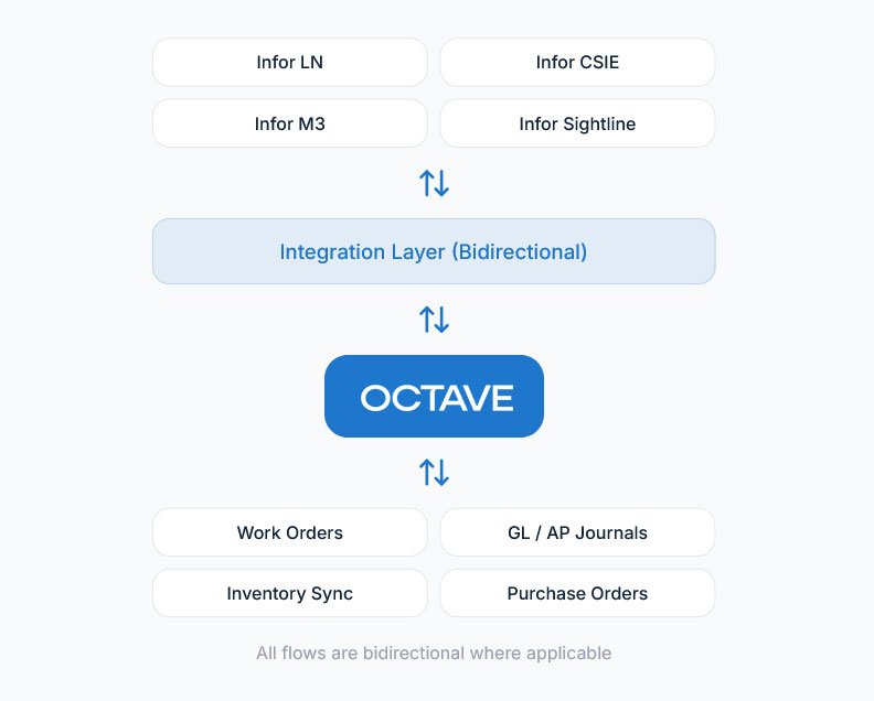 Connect Infor ERP with Octave Attune (HxGN) EAM so manufacturing, financial, and asset data stay aligned across your organization.